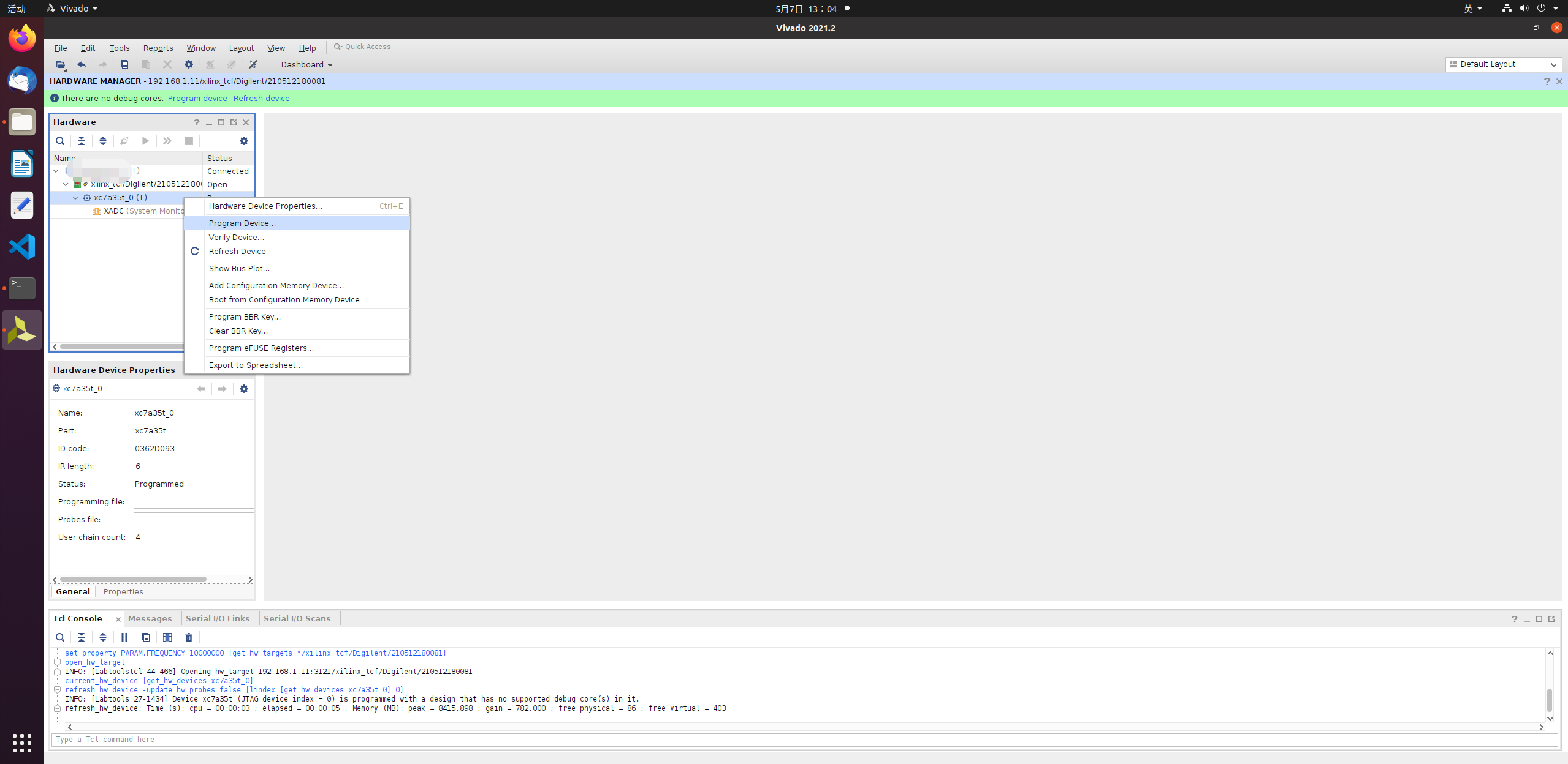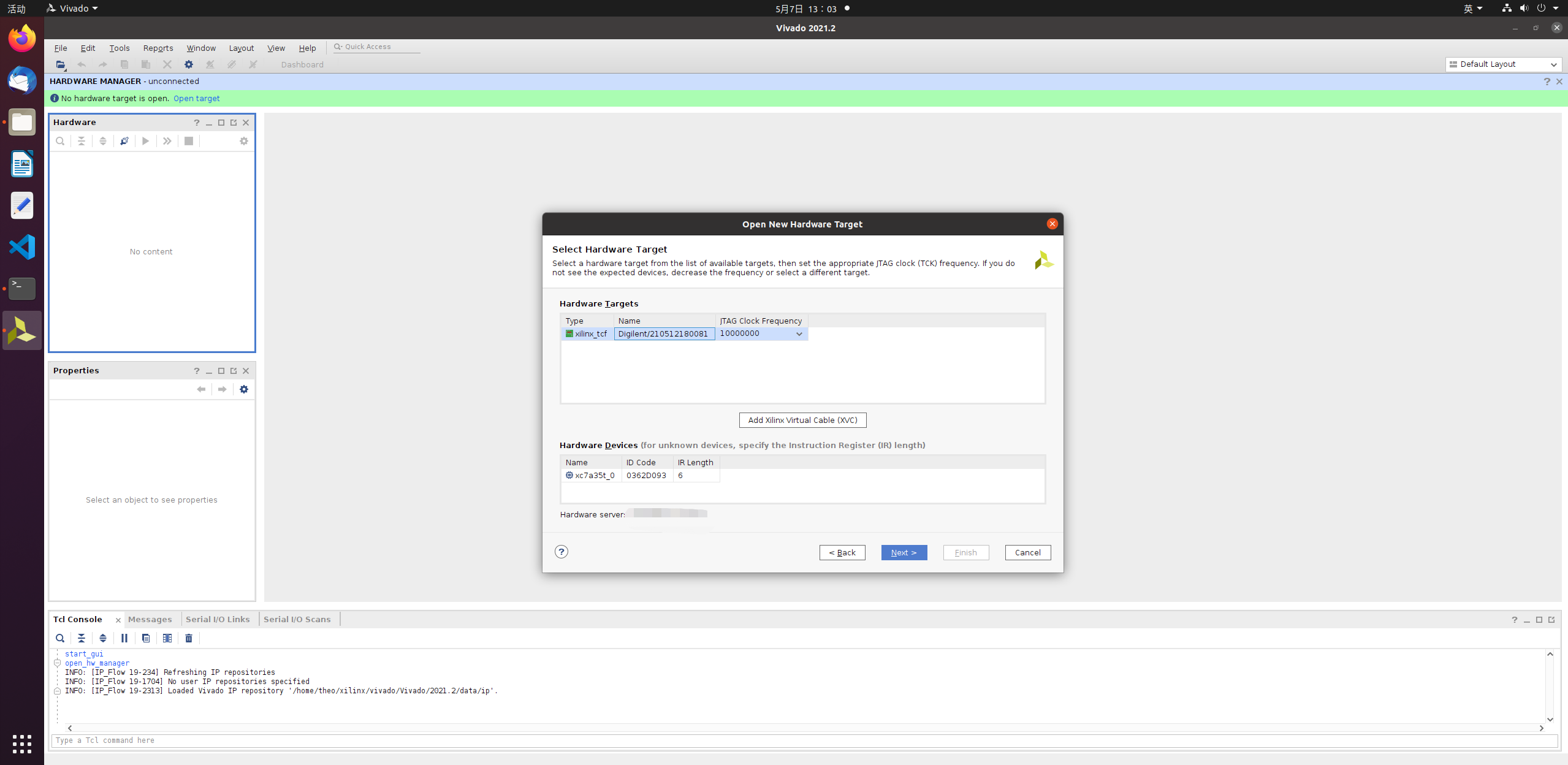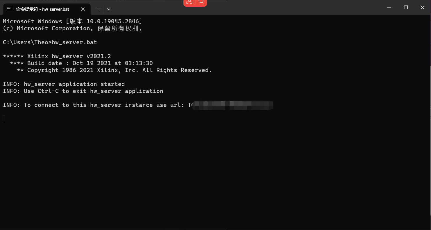 上一步我们已经成功构建出了我们的 hardware Soc,接下来就是将位流下载至开发板。进入 build/<board>/gateware 目录,在该目录下找到 <board>.bit 将其下载至开发板。这里我是在虚拟机进行开发的,而硬件板卡连接的是本地电脑,所以我们要在本地电脑打开 vivado_path/bin/hw_server.bat 软件,如下图所示: