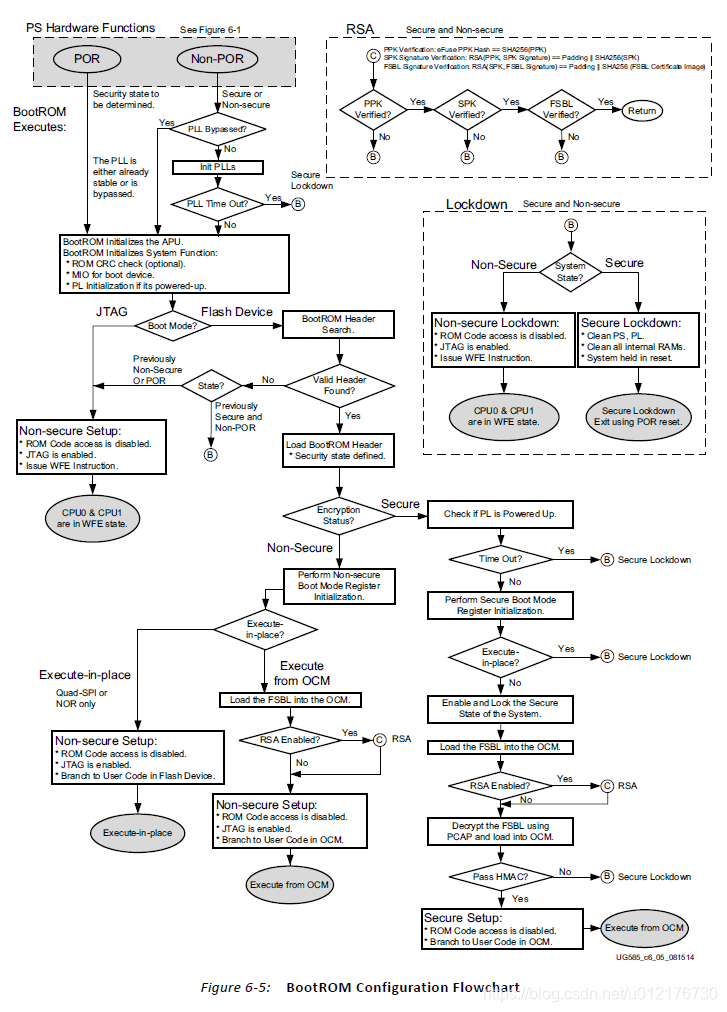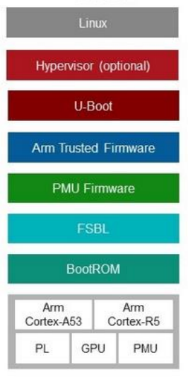在 Zynq™ UltraScale+™ MPSoC 中 Configuration and Security Unit 处理器会使用 BootRom 中的代码在这个配置阶段解释 boot header 来配置系统,并以安全或者非安全引导模式将 Processing System「PS处理系统」的 First-Stage-Boot-Loader「FSBL,第一阶段引导加载程序」加载到片上 RAM「OCM,on-chip RAM」;在启动过程中 CSU 会将 PMU FW 加载到 PMU RAM 中,与 PMU ROM 一起提供平台管理工作「P.S. 一般来说 FSBL 会在 PMU FW 前加载」;后加载 ATF,配置 DDR,最后将 u-boot 加载到 DDR 并启动 u-boot;u-boot 启动后可以选择加载 Hypervisor 并在上面运行 Linux 系统,也可直接使用 u-boot 加载 Linux 系统镜像到 DDR 并启动 Linux。
